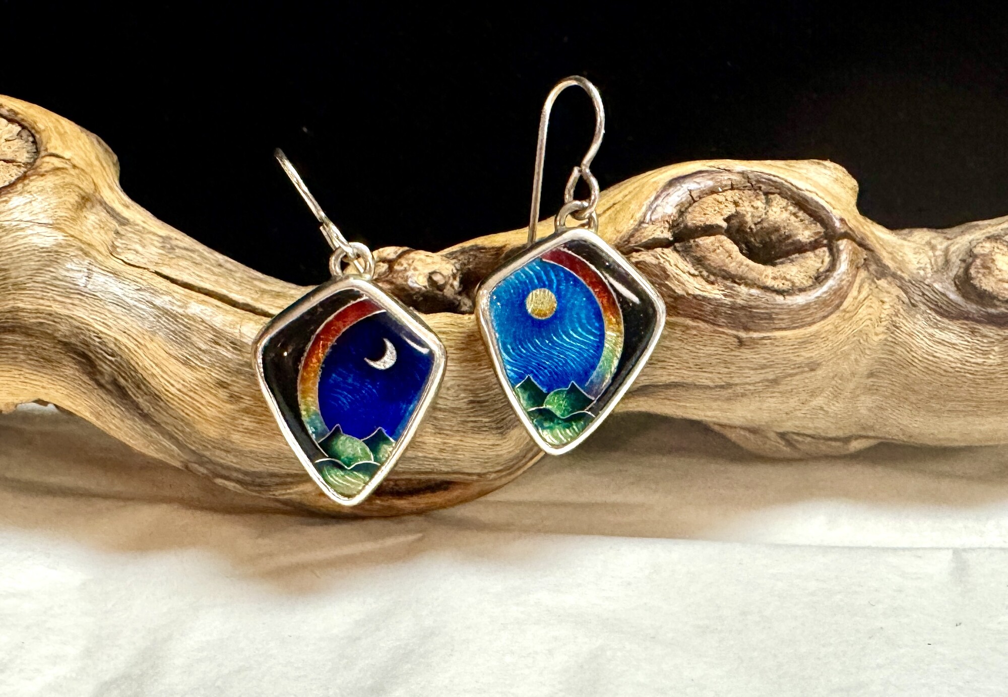 Enamel sun & moon earrings - signed