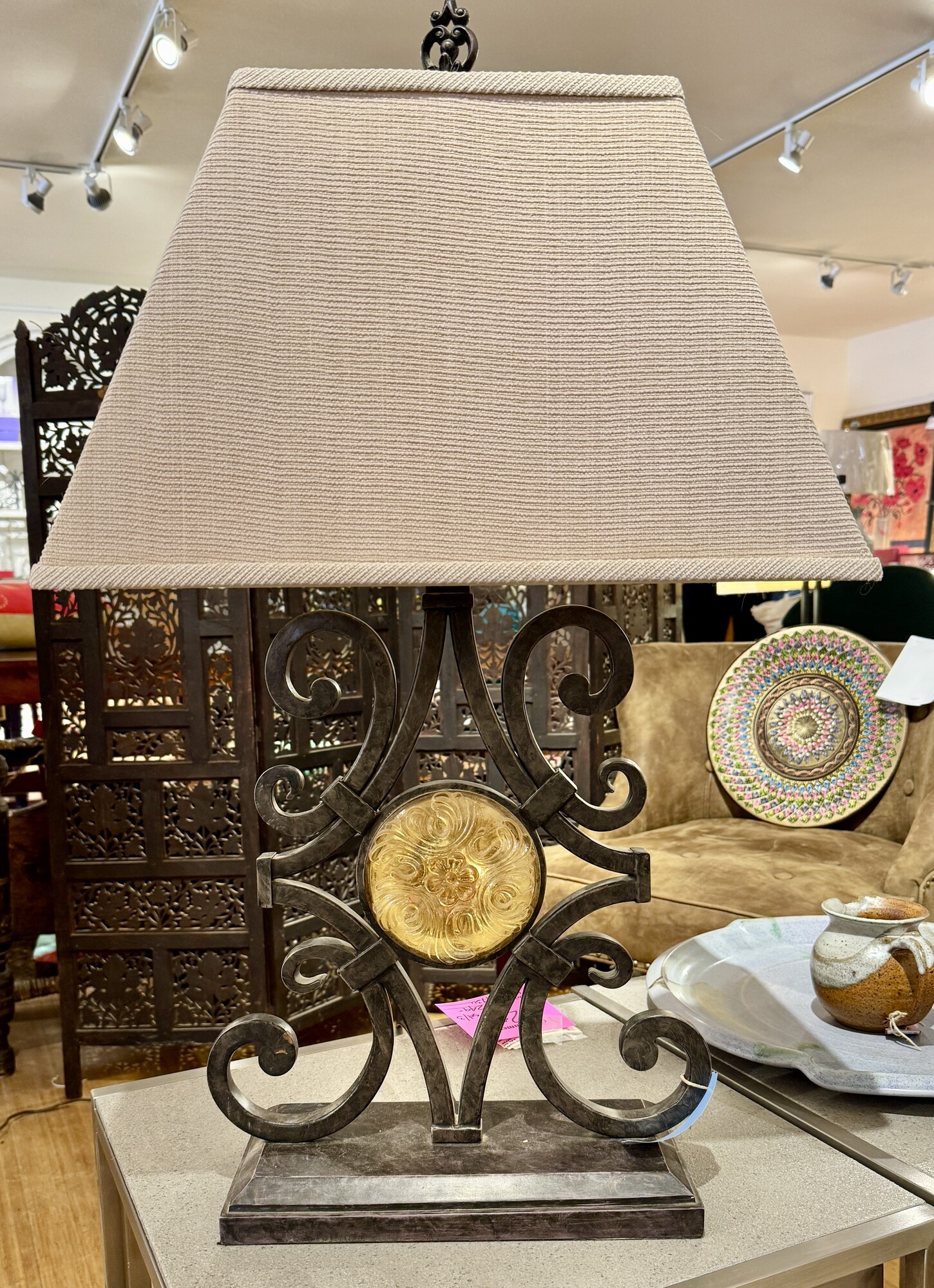 Lamp Table Scrolled, Iron & Glass Medallion,