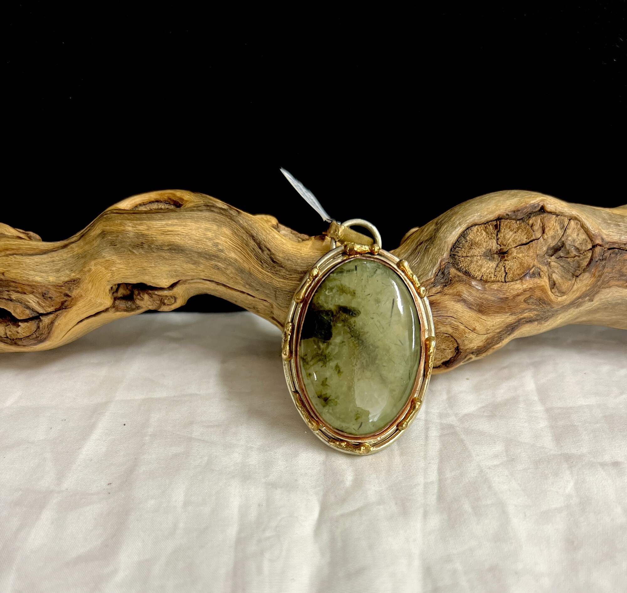 Brass/SIlver tone, prehnite (with tourmaline inclusions) pendant
