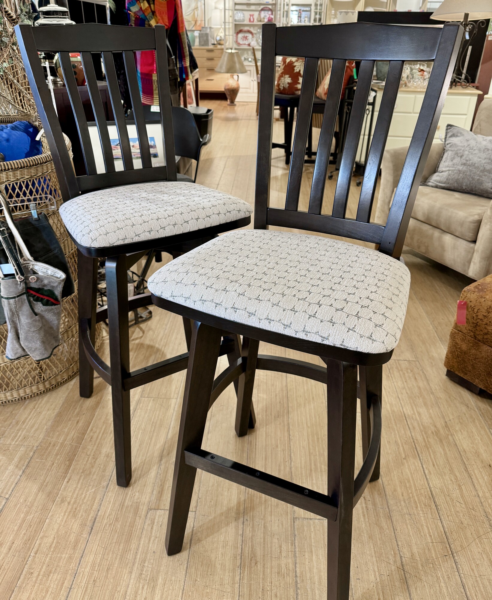 Bar Stools, Woodleys, Swivel, Wood Base, White Upholstered Seat, Size: PAIR