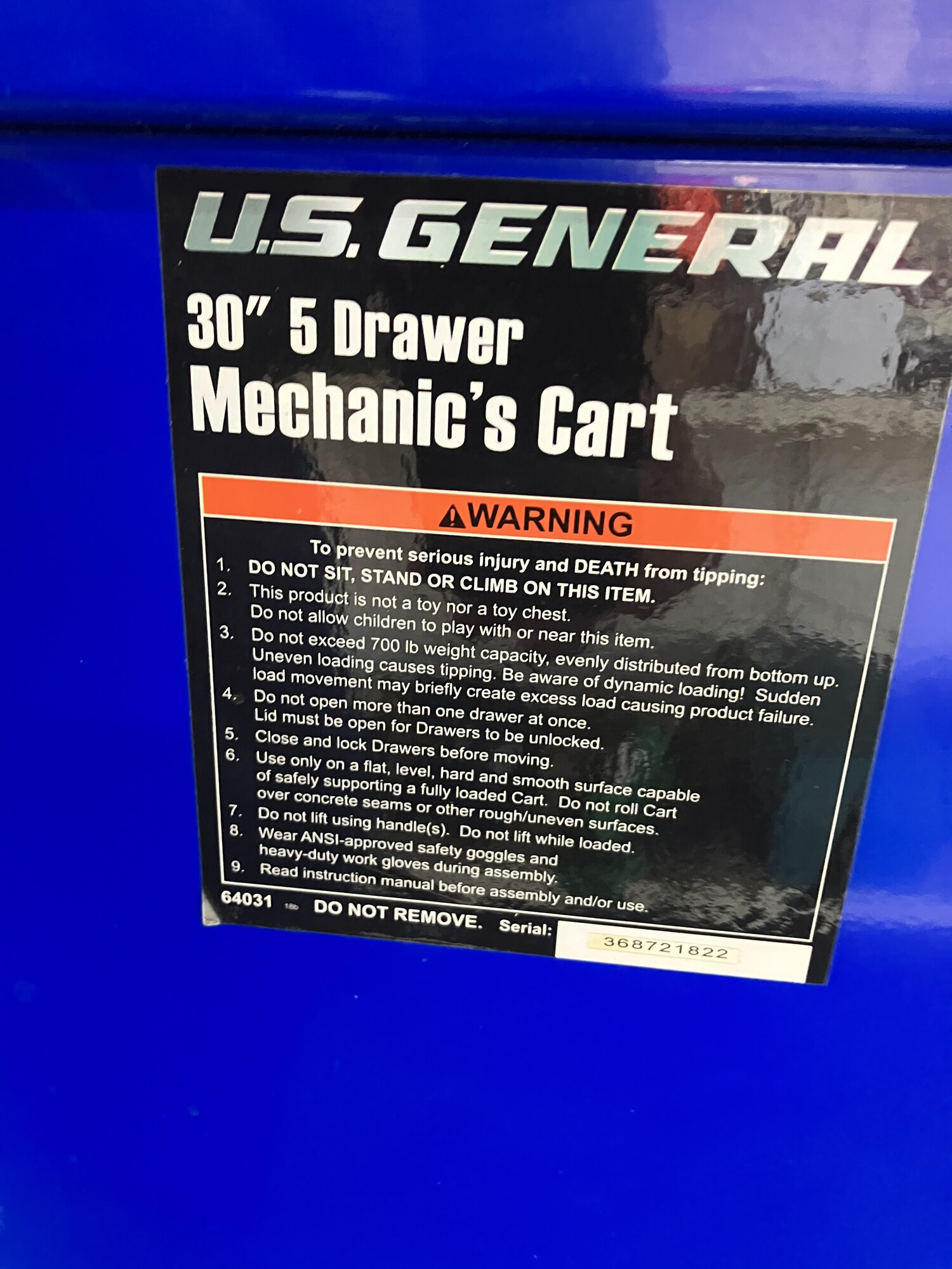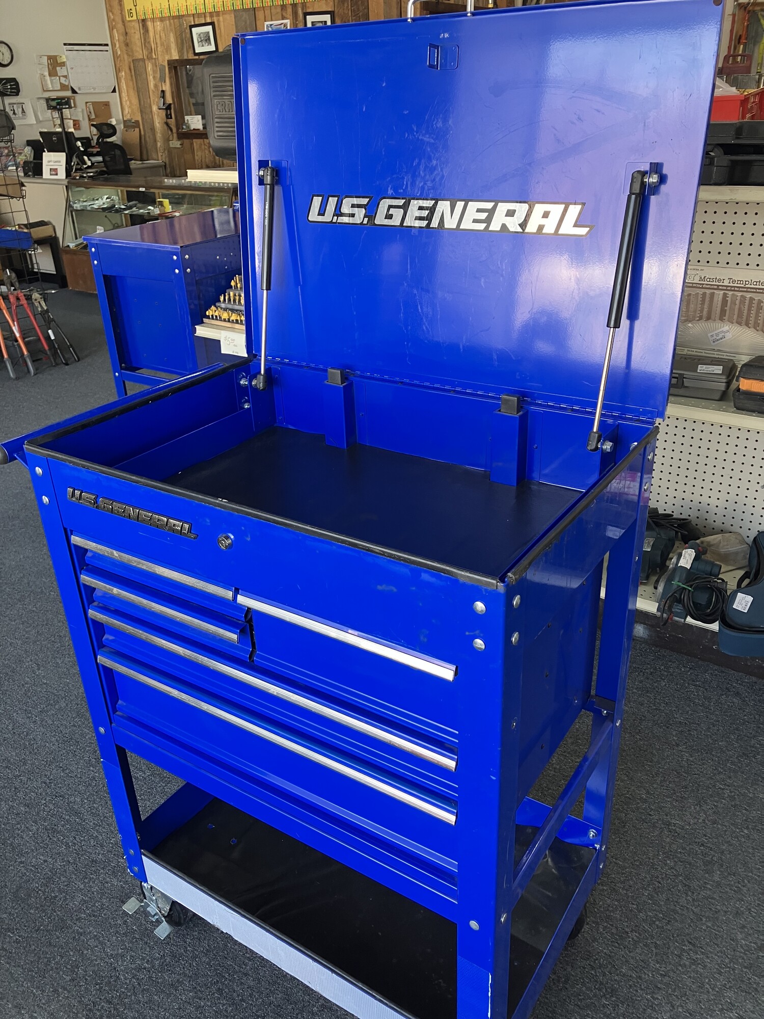The U.S. GENERAL® Mechanics Cart is equipped with a 5-drawer setup optimized for tool storage. The cart has 15,000 cu. in. of total overall storage, 6900 cu. in. of lockable storage, and a 700 lb. load capacity. With rolled drawer edges, full-width drawer latches, precut nonslip drawer liners, a side can holder, and an integrated power port, this mechanics cart is loaded with the features you need, including an integrated barrel lock to secure all the drawers. Durable full-extension ball bearing slides and a tough powder-coated finish mean this cart is up to the task at hand whether it's in the local automotive shop or in your own garage. The U.S. GENERAL® cart line is designed internally by our Harbor Freight engineering team to precise industry-leading standards, and every specification and feature is rigorously tested in our state-of-the-art testing facility in the USA. The combination of quality materials, precise standards, and rigorous testing provides you with peace of mind knowing this cart is high quality and is resilient for a long service life.