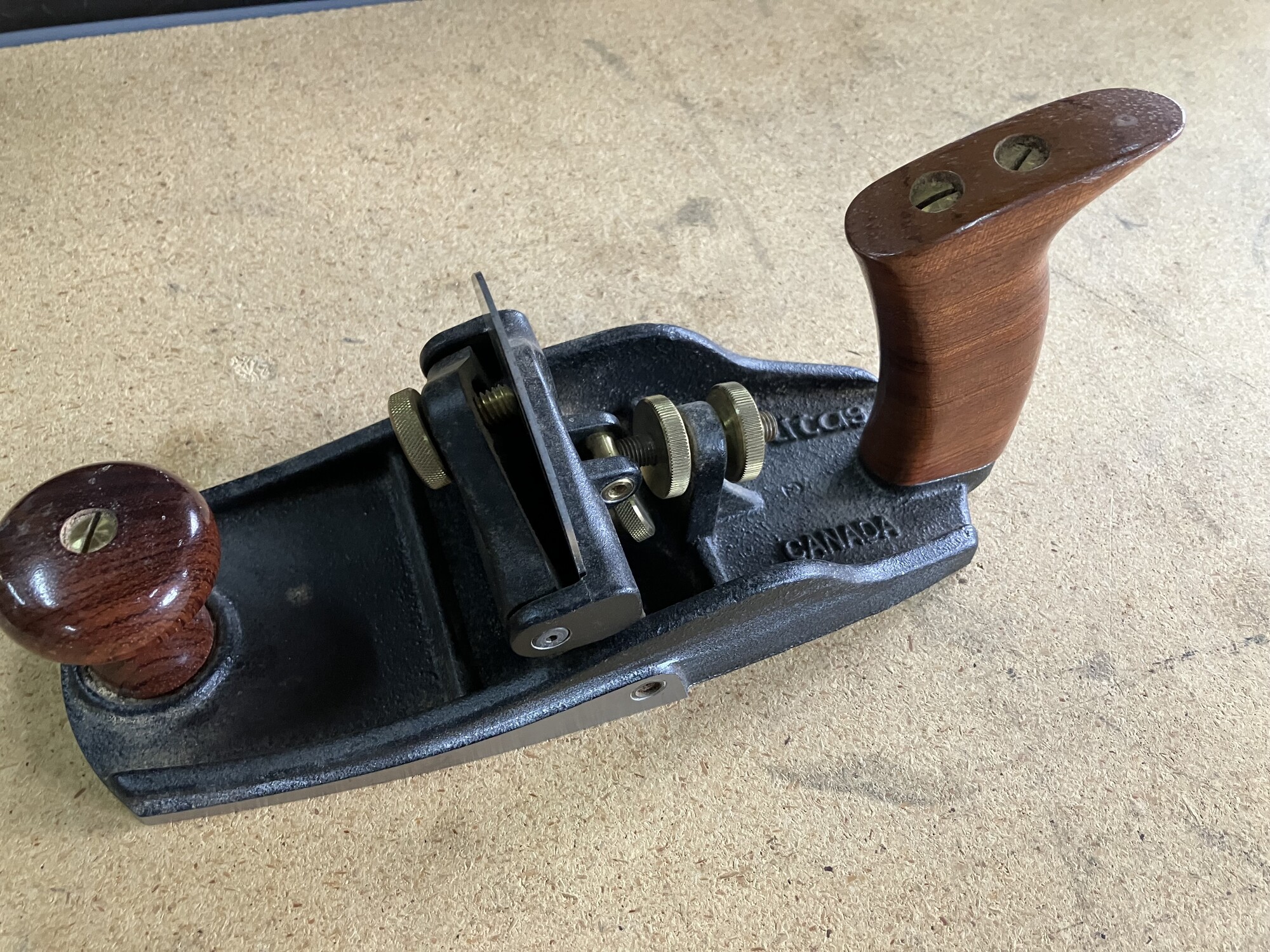 A feature unique to our scraping plane is an integral thumbscrew that bows the blade to eliminate ridges in the work surface caused by blade corners. The plane comes with a 0.055\" high-carbon steel blade suited to this technique. The blade is 2 7/8\" wide and hardened to Rc48-51, and comes with the cutting edge ground at 45°.